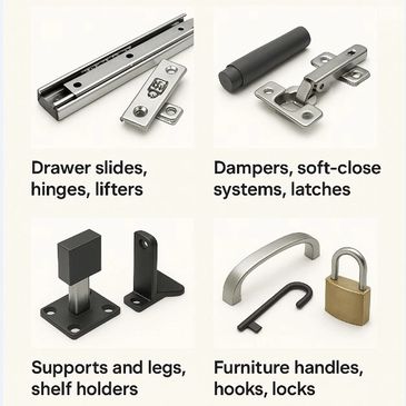 Drawer slides, hinges, lifters.